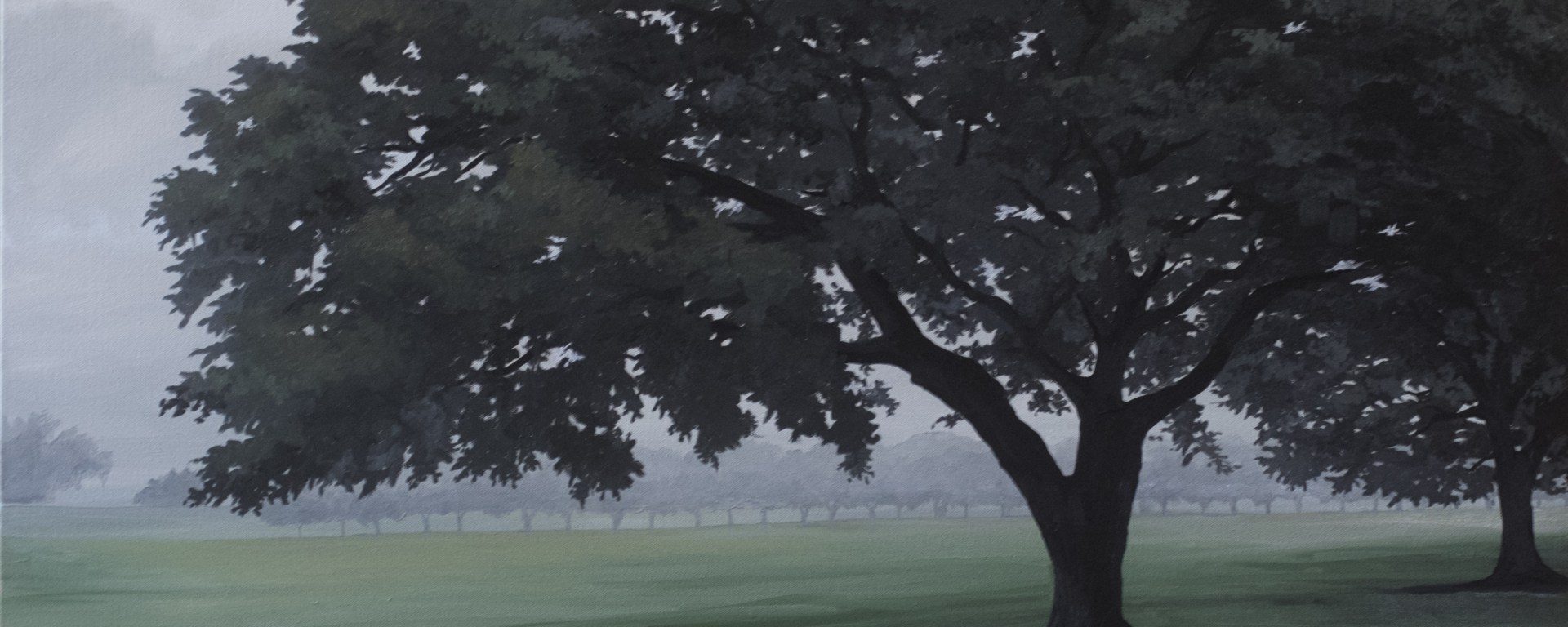 I didn’t return to this subject matter for six months. I was speaking at a fundraiser for the Southern Foodways Alliance “Welcome Table” and was around a bunch of well-known chefs and food people like Jeremiah Tower, Jeremy Lee, the executive chef at Soho’s Quo Vadis, and the incomparable food historian and writer Jessica Harris. I was deeply humbled to be in the same room and on the same program with these folks. This might all be name dropping, but it was also the morning we all learned about the death of Anthony Bourdain. The shock that news of a person’s death brings is like the mysterious haze that fog lends to a morning, and it was on the faces of those gathered. I know the Gospels speak of the sun rising upon the Resurrection, yet I somehow imaging John the Disciple running through a foggy morning, feet wet with dew, towards to tomb of Jesus. Nevermind how unlikely that would be in arid Palestine. Somehow I feel like the spirits are closer at hand in such a setting, so that night I began this second canvas as a reflection on the juxtaposition of loss and calm that fog inspires in me.